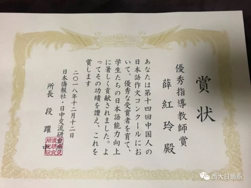 此次大赛获奖,与西北大学学科竞赛培养计划以及外国语学院各级领导所给予的大力支持密不可分。我院日语系自去年以来高度重视该大赛,组建指导教师队伍,为所有参赛学生尽心尽力地指导,耐心细致地修改,旨在以赛促学。今年以来,我院日语系在学科竞赛上屡获佳奖,本次获奖对激励同学们积极进行写作实践,提高写作能力有着重要的意义。今后,我系还将鼓励学生积极参加中国人日语作文大赛,并争取有更多的同学获得更好的成绩。