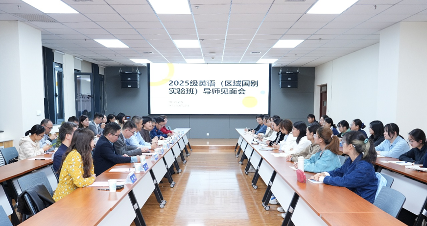 2025年9月28日晚7时,外国语学院2025级英语(区域国别实验班)学业导师见面会在我校长安校区西学楼北0904报告厅顺利举行。会议由外国语学院院长曹若男主持,区域国别学院副院长李福泉、全体学业导师、外国语学院英语系主任李铁、班级教务、辅导员、相关负责人及实验班 20名同学共同参会。