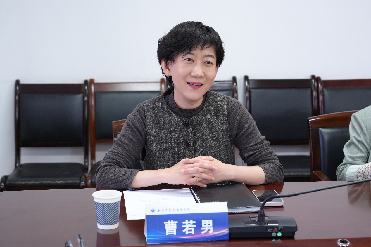 在互动交流环节,双方围绕大学英语分级教学实施路径、微专业建设机制、人才培养方案优化、特色课程体系构建及专业导学模式创新等关键问题展开深入研讨。李蓂副院长结合我院实践,分享了大学英语教学改革的阶段性成果、英语专业一流课程建设的具体举措、复合型人才培养路径及学科竞赛组织经验,为对方提供了可借鉴的实操方案;李铁主任与王欢主任分别就英语、日语专业的特色课程开发、学生就业升学质量提升、国际交流合作拓展及学术研究成果转化等情况进行详细阐述,并针对对方提出的专业及课程建设难点问题逐一回应,现场交流氛围热烈而务实。