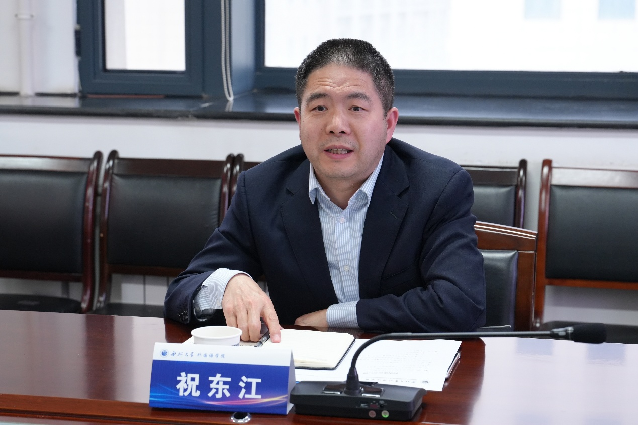 会上,曹若男院长首先对祝东江院长一行的到访表示热烈欢迎,并从学院发展历程、本科专业布局、招生规模与生源质量、硕士学位点建设成效及师资队伍结构优化等方面,系统介绍了我院的办学基础、发展优势与核心特色。随后,祝东江院长详细介绍了汉江师范学院外国语学院的办学定位、专业建设亮点及发展规划,并表示此次调研旨在借鉴我院在学科建设、教学改革等方面的先进经验,推动双方共同进步。